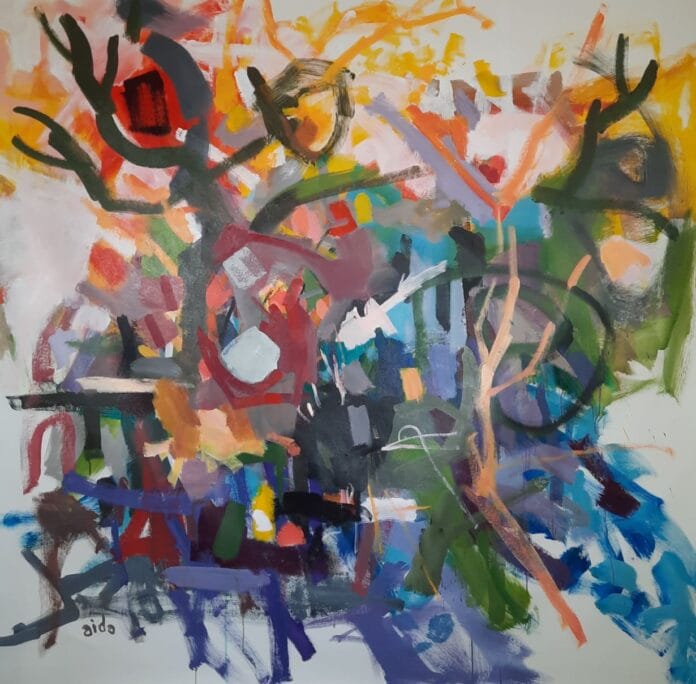 Aida’s palette is bold and expressive, reflecting the intensity of her inner world. The use of bright, contrasting colors conveys exuberance and optimism, while the layering of forms and patterns creates a sense of depth and complexity. In every piece, there is a clear dialogue between freedom and structure, echoing the improvisational nature of musical performance.
