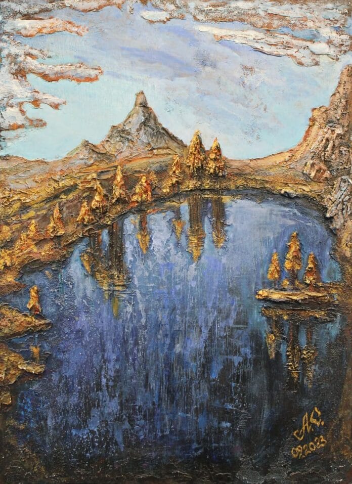 The blue reflections on the lake’s surface convey feelings of cool melancholy that gradually shift toward a calm and optimistic serenity. The surrounding mountains symbolize grandeur and timeless endurance, standing as silent guardians of eternal peace. Through this composition, Angel explores the connection between the human soul and the boundless space of nature.