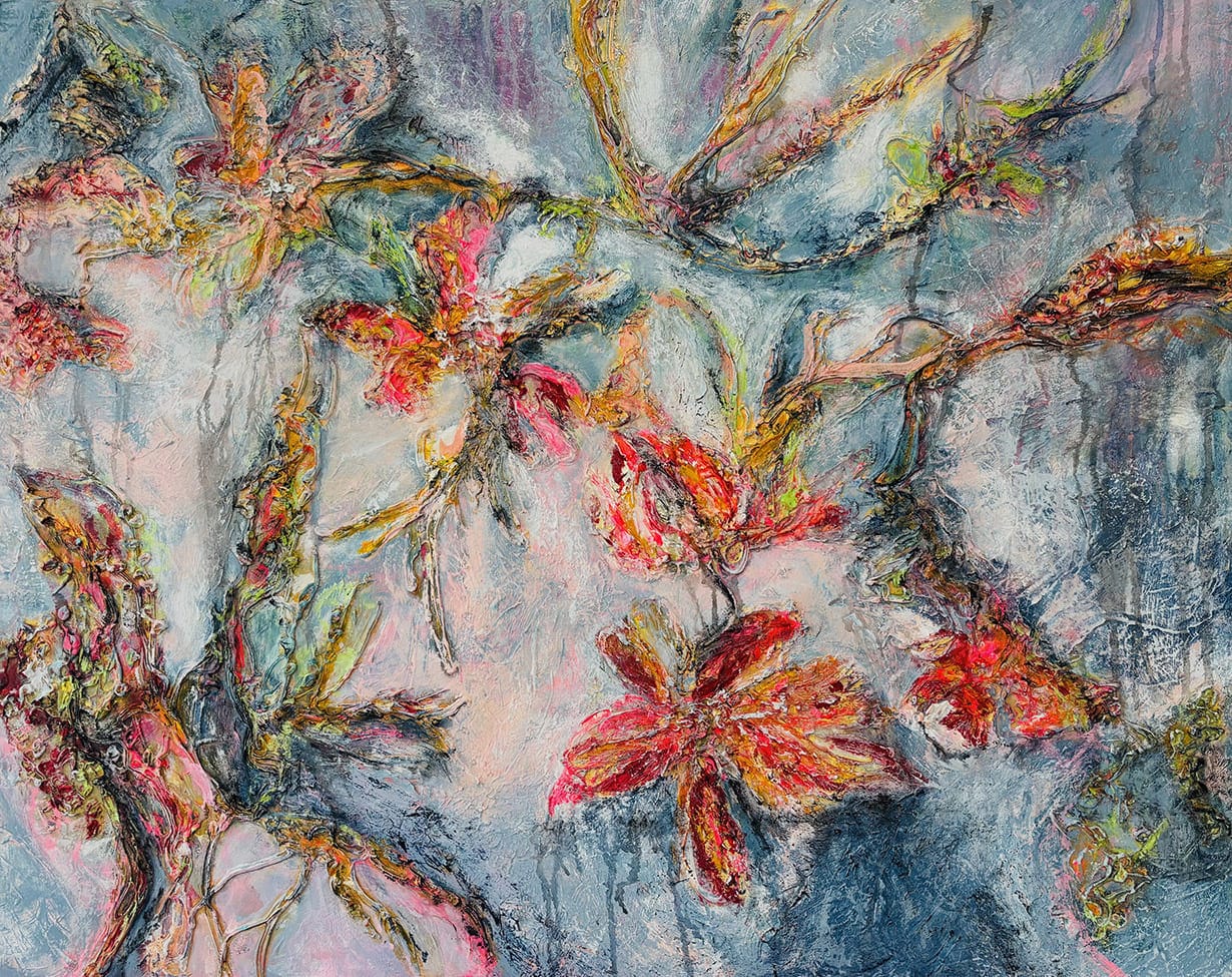 Reimagine emerges from this emotional tension. In the painting, Chan creates forms reminiscent of plant fossils, yet she reintroduces vivid, expressive colors that bridge the gap between past and present. The work becomes an act of restoration, not in a scientific sense, but in an emotional and imaginative one.