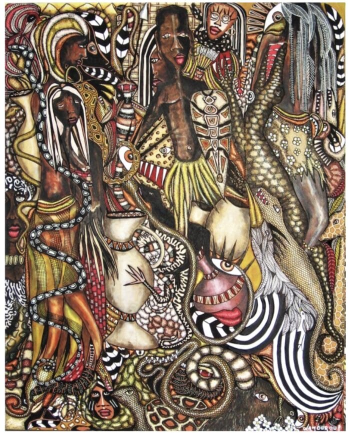 Bien que la musique et l’écriture aient défini une grande partie de sa carrière, Lamouroux s’est finalement retrouvé attiré de nouveau vers la peinture. Le retour au pinceau a marqué un tournant. La peinture est devenue pour lui un moyen de fusionner ses expériences passées avec de nouvelles explorations visuelles des univers riches et kaléidoscopiques qui reflètent à la fois l’imaginaire et la conscience sociale.
