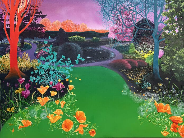 A distinctive feature of Capparelli’s work is her use of color as both structure and emotion. Her palettes are rich and unconventional—radiant greens, electrifying pinks, and luminous yellows that evoke otherworldly vegetation or dreamlike terrains. This chromatic intensity draws viewers into spaces that feel simultaneously familiar and alien, real and speculative.