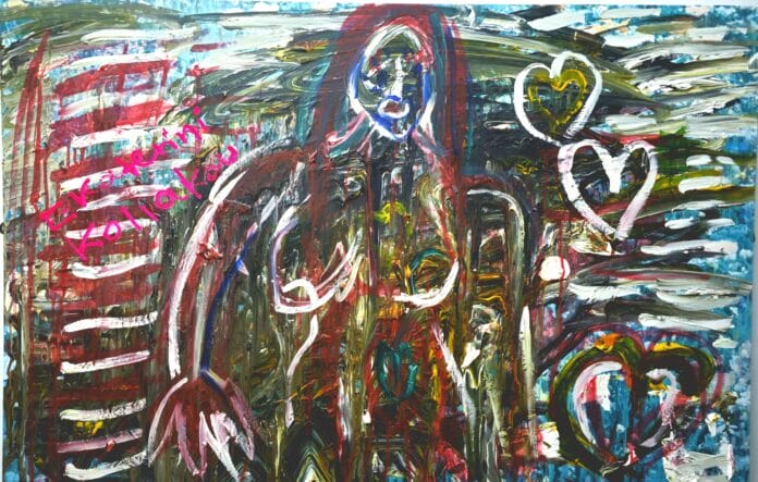 Hearts and lines play a central role in the composition. The lines can be read as tensions, boundaries, or emotional traces that reflect the contradictions and complications of inner life. The hearts emerge as the stronger element. They symbolize love, warmth, and generosity. For Koliakou, this is intentional because she identifies herself as a loving person and wants that quality to dominate the visual field.