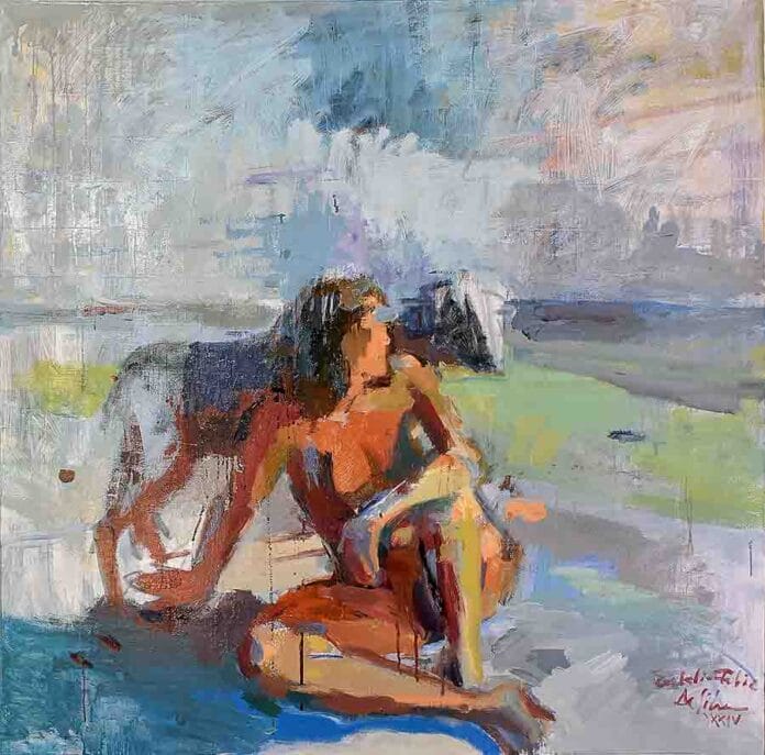 His influences span from early Post-Impressionists, who emphasized color and emotion, to the Neo-Abstract Expressionists of the 1980s, known for their intensity and gestural power. This fusion results in compositions that are both formally refined and emotionally raw. Brushstrokes are deliberate yet spontaneous; colors vibrate with inner life; figures seem to oscillate between material presence and ethereal light.