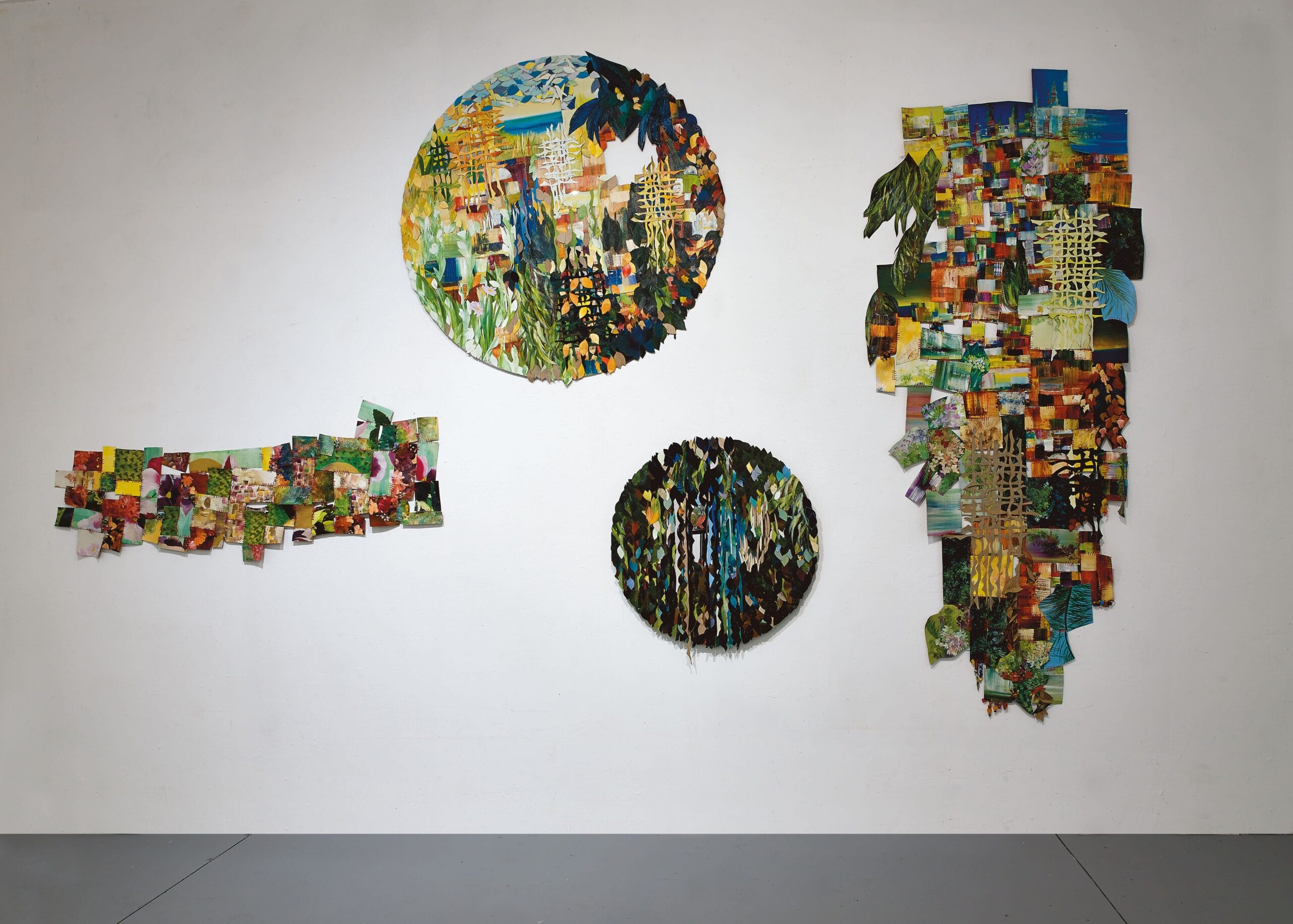 This process represents both continuity and change. By cutting pieces from her own paintings, she performs an act of renewal. What was once a complete canvas becomes part of something larger, something reassembled into a new visual harmony. The leaves, individually cut and layered, form radiant circular patterns that pulse with color and light.