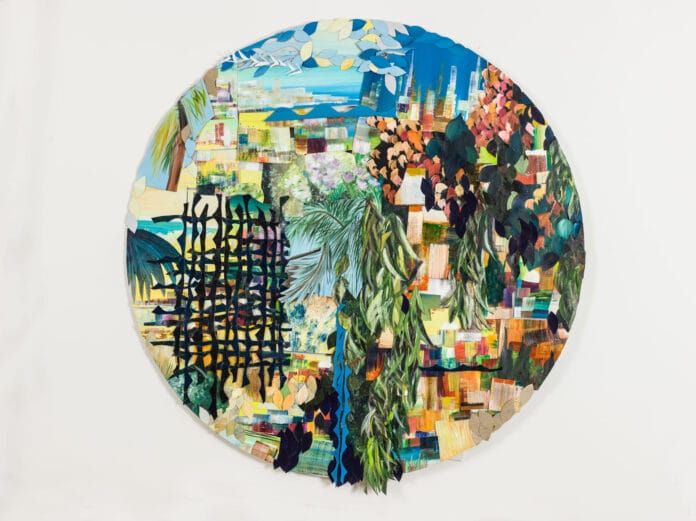 This process represents both continuity and change. By cutting pieces from her own paintings, she performs an act of renewal. What was once a complete canvas becomes part of something larger, something reassembled into a new visual harmony. The leaves, individually cut and layered, form radiant circular patterns that pulse with color and light.