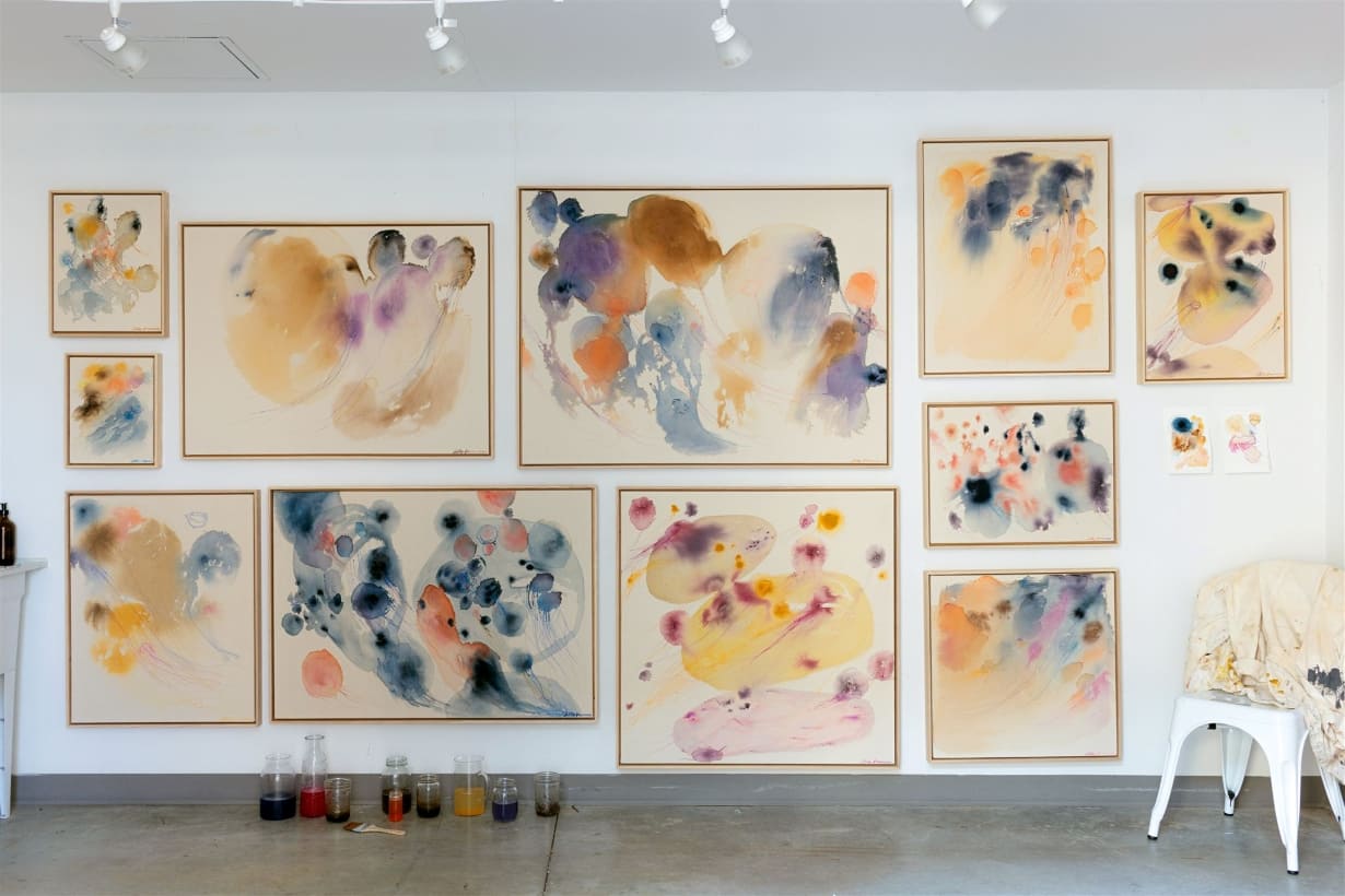 The surfaces of her paintings bear traces of time and process. Drips, washes, and layered gestures record moments of action and pause alike. Each piece becomes a visual archive of a specific encounter between artist, material, and environment.