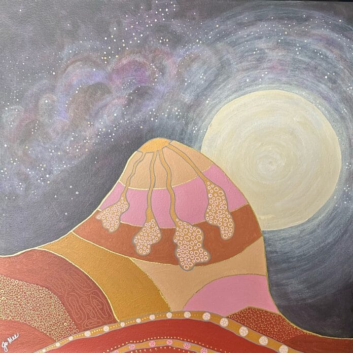 Among her most significant recent works is Reawakening, an acrylic painting on canvas that forms part of a larger series. This series captures the energy of the Divine Feminine, expressed through abstract landscapes that radiate harmony, strength, and peace.