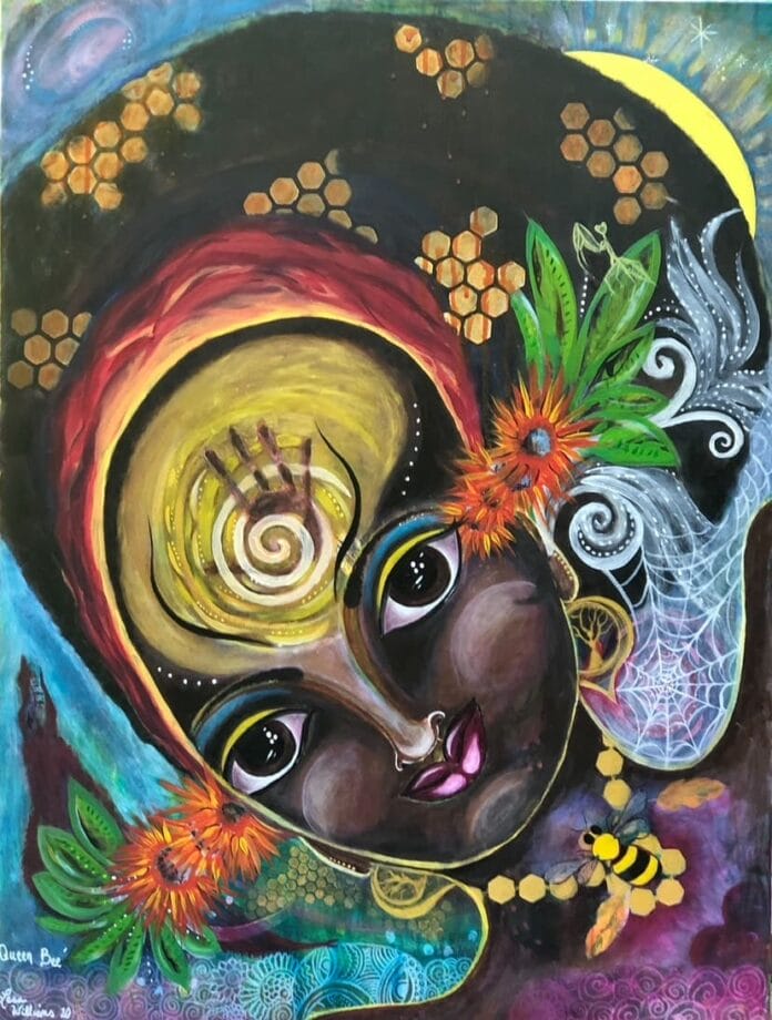 Among her growing body of work, one piece stands out as particularly meaningful: Finding the Way Through Darkness, Queen Bee. The painting captures the essence of Williams’ philosophy: that even in the midst of struggle, there is sweetness to be found.