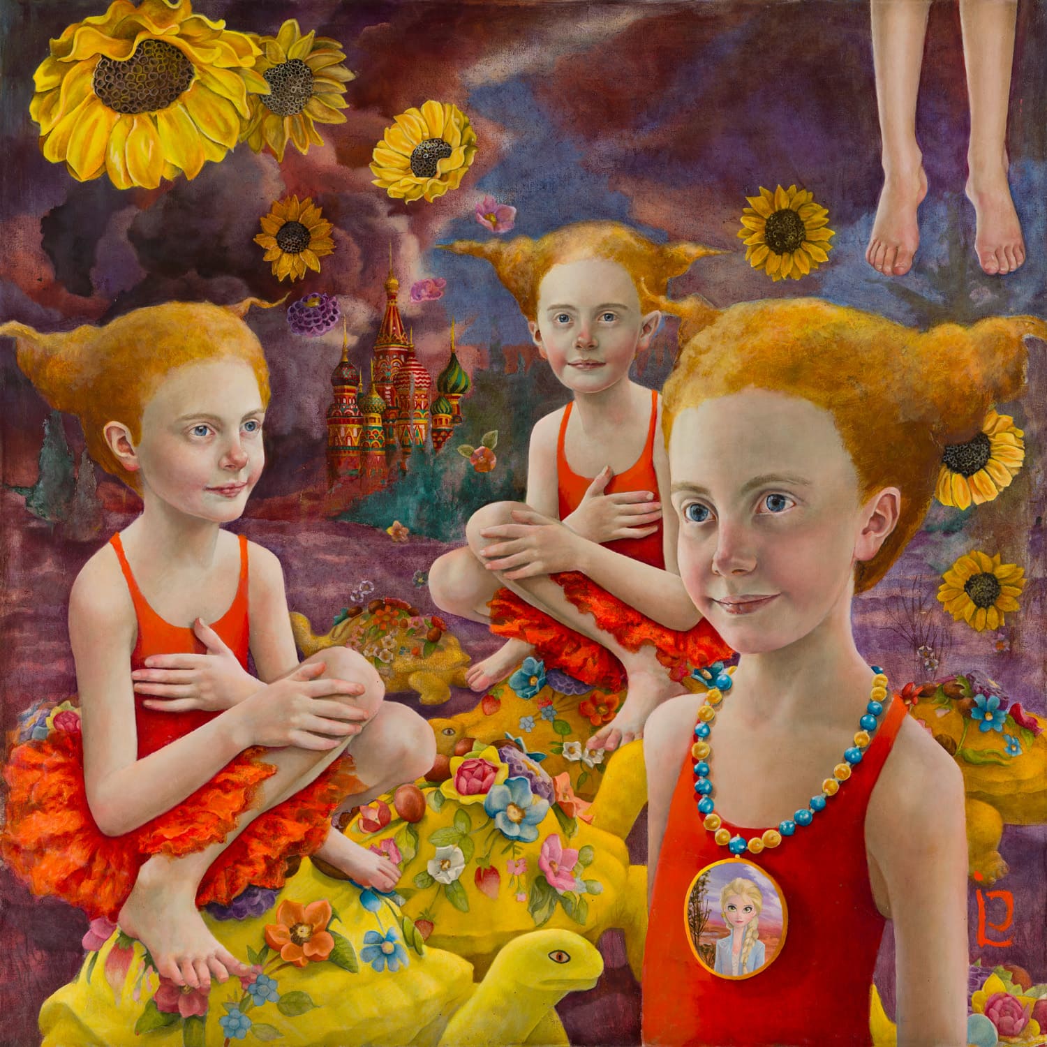 The logic of the painting draws from both religious iconography and fairy tales. There is ornament, emblematic clarity, and floating blooms that suggest purity, innocence, and mythic storytelling. At the same time, the atmosphere is unsettled. Colors may bruise, tones may darken, and the visual harmony carries a quiet strain. The political dimension is never far from the surface.