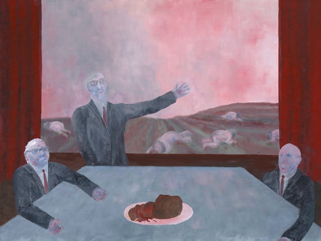 The painting operates as a contemporary allegory, echoing the historical sentiment attributed to Marie Antoinette while grounding it firmly in modern power dynamics. The elite are portrayed not as caricatures, but as composed beneficiaries of a system that treats the rest of humanity as resources rather than individuals. The masses, though absent from the canvas, are implicitly present, reduced to commodities to be managed and sustained rather than respected.