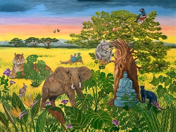 Every element in Forest Dreams carries symbolic resonance. The Buddha statue embodies inner stillness and spiritual awakening, reminding viewers that peace begins from within. The baobab tree, often called the “Tree of Life,” signifies resilience and interconnectedness with the earth’s ecosystem.
