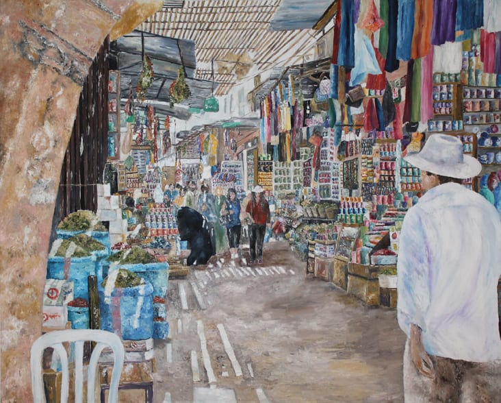 One of Mike Ferrell’s most captivating works is Marrakesh Soak 2 (2019), painted in oils, his preferred medium. This painting is part of a series inspired by his experiences in Marrakesh, a city that deeply moved him with its sensory richness.