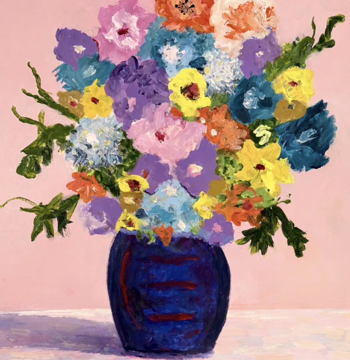 Her characters seem to exist within their own narratives, inviting viewers to interpret their stories. There is a sense of mystery in her work, as if each painting holds a hidden tale waiting to be discovered. The expressive florals, on the other hand, bring a sense of movement and vitality, often acting as emotional anchors within the composition.