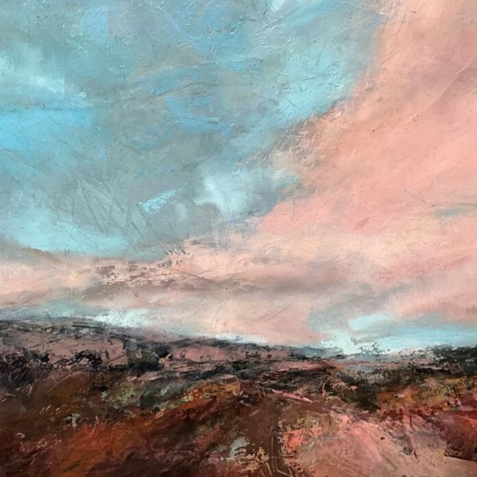 One such work, Falling Light, created using mixed media on wood, reflects this ongoing dialogue between memory, material, and place. Built through layered surfaces and subtle erosion, the piece evokes landscape not as a fixed location, but as an experience shaped by light, time, and the accumulation of gesture.
