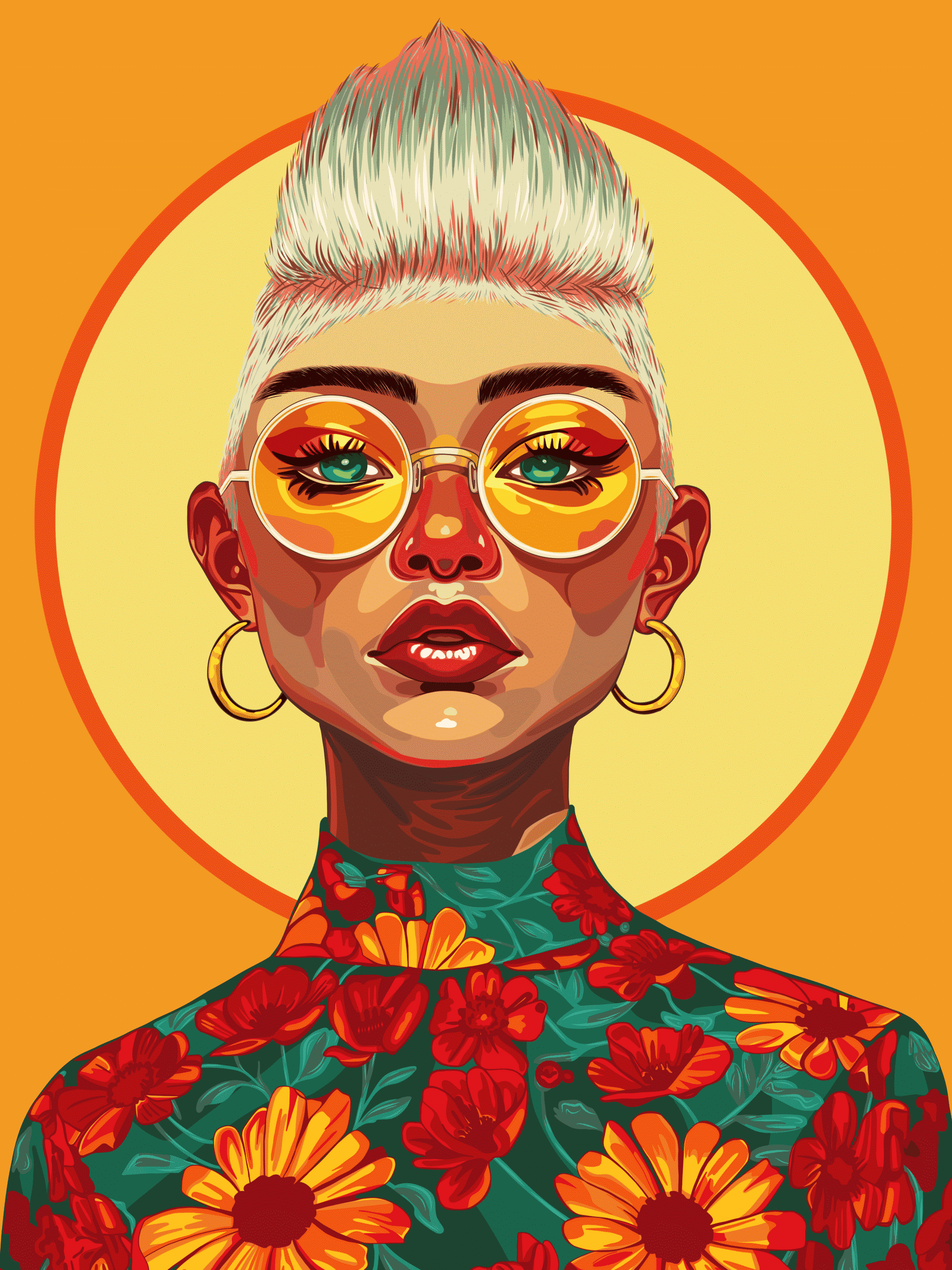 One of the most striking elements of the portrait is the halo-like circle behind the figure. This subtle yet powerful shape elevates the subject, giving her an almost iconic presence. Rather than referencing traditional religious symbolism, the halo here feels contemporary and personal. It amplifies the subject’s quiet strength and inner authority, suggesting self-worth and emotional clarity.