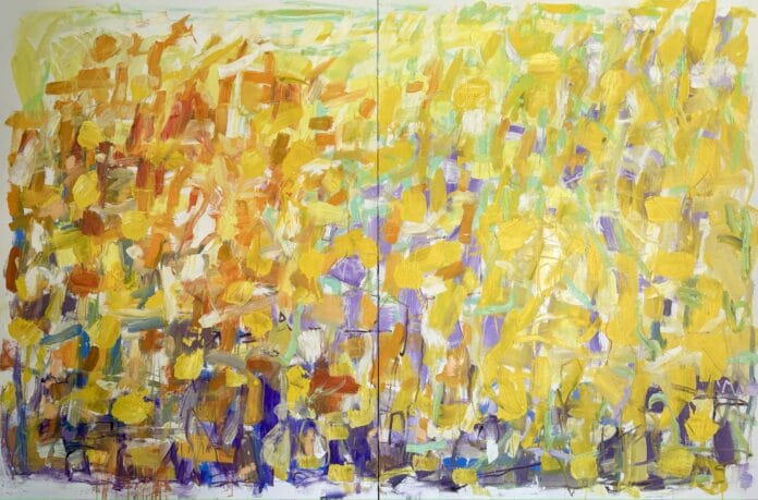 Among Pien de Haas’s most evocative recent works is the 2024 diptych titled “Another Day in Paradise.” Created with oil on linen mounted on an aluminum frame, the work reflects her ongoing dialogue with light, color, and emotion.