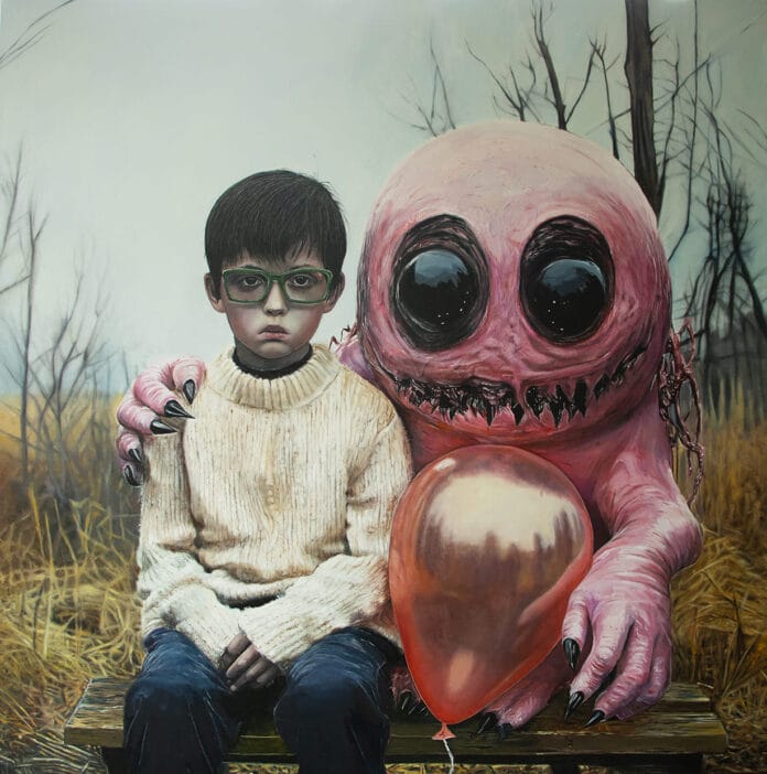 Inspired by the years she spent navigating her mother’s amnesia, Ruiz depicts distant children and quiet monster-like figures that feel both familiar and uncanny. These creatures are not threats. Instead, they symbolize the fears we learn to live with, soften, and ultimately domesticate.