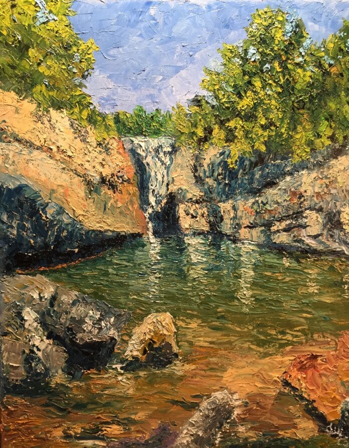 This painting is an oil on canvas created entirely with the palette knife. Every surface of the piece carries movement and texture. The knife strokes build layers of paint that rise and fall like the water and rock they depict. The physical quality of the surface catches light from different angles, giving the waterfall a sense of motion and life. The rich colors of the scene, cool blues and greens balanced with earthy tones create harmony between the flowing water and its natural surroundings.
