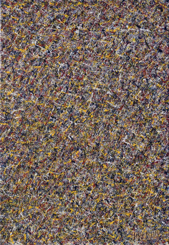 In “49y,” the artist transforms emotional impulses and internal reflections into a dynamic visual composition. The painting is built from layers of color and expressive lines that appear to interact like currents of energy. The surface suggests movement and vibration, reinforcing his concept of artistic creation as a field of virtual waves.
