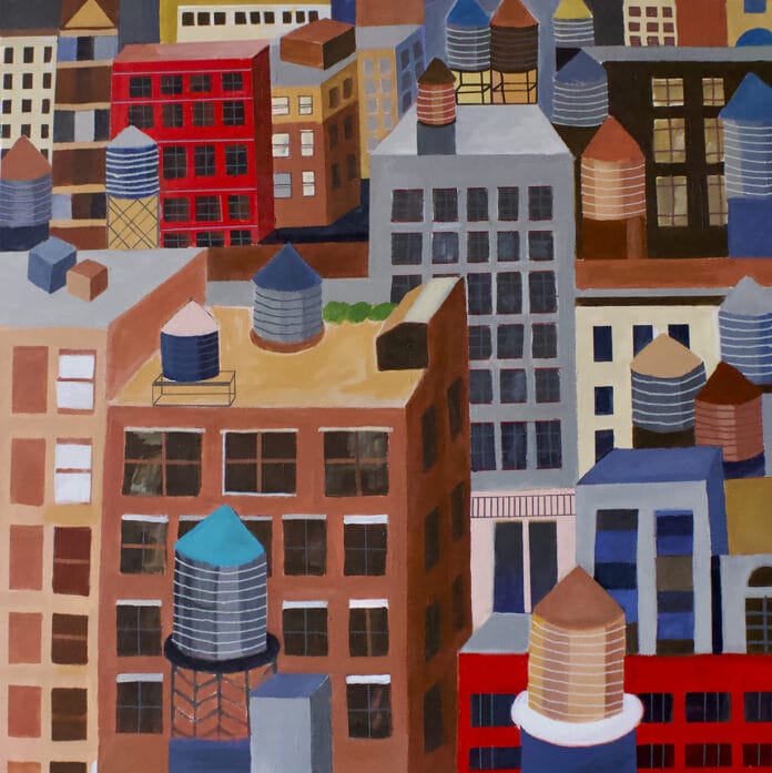 One of Toni’s notable works, NYC Water Towers, is an acrylic-on-canvas painting that captures an urban scene from a unique aerial perspective. The subject water towers perched atop commercial and residential buildings are an iconic and often-overlooked part of the New York City skyline.